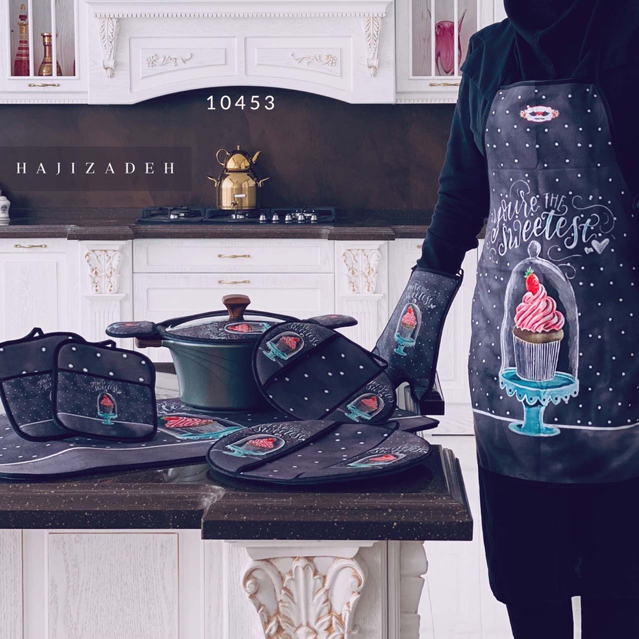لاروکا سرویس 11 پارچه پیش بند و دمکنی و ابگیر و دستکش طرح کاپ کیک L-189
