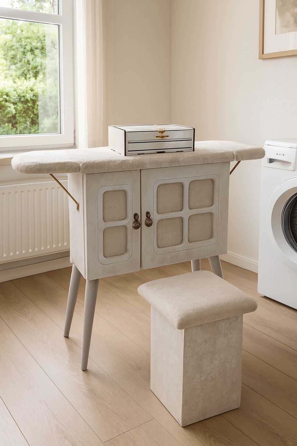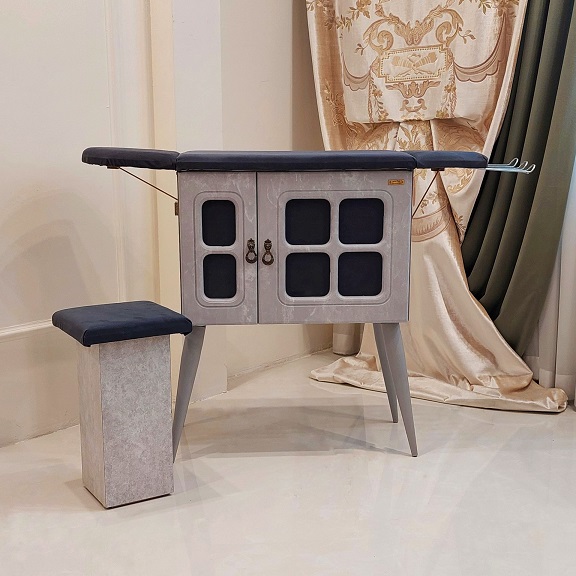 PARDISپردیس میز اتو و چرخ خیاطی 2 درب لپتابی پایه متحرک طوسی با صندلی لولایی 145- 13774